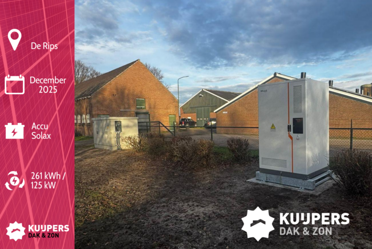 Bij deze kalverhouder in De Rips hebben wij een accu van Solax mogen plaatsen. Deze accu heeft een opslagcapaciteit van 261 kWh en laadvermogen van 125 kW.