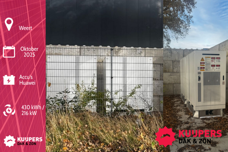 Bij deze ondernemer in Weert hebben wij twee accu’s van Huawei mogen plaatsen. Deze accu’s hebben samen een totale opslagcapaciteit van 430 kWh en totaal laadvermogen van 216 kW.