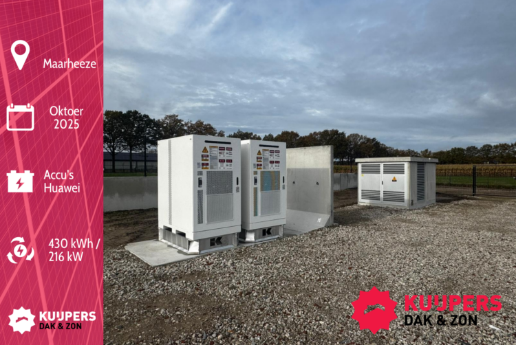 Bij deze ondernemer in Maarheeze hebben wij twee accu’s van Huawei mogen plaatsen. Deze accu’s hebben samen een totale opslagcapaciteit van 430 kWh en totaal laadvermogen van 216 kW.